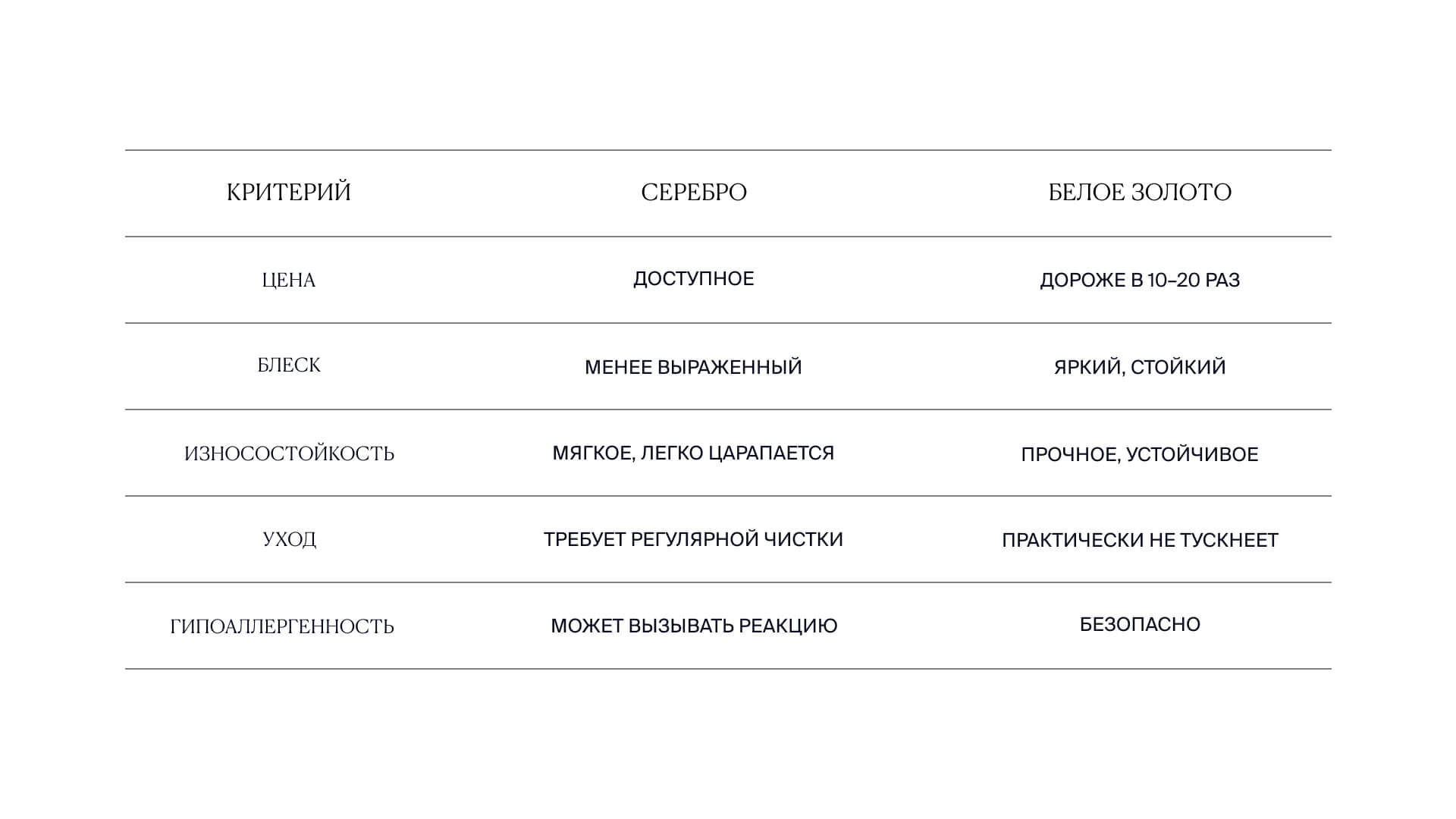 Серебро и белое золото имеют свои плюсы и минусы. Выбор зависит от бюджета, целей и личных предпочтений.