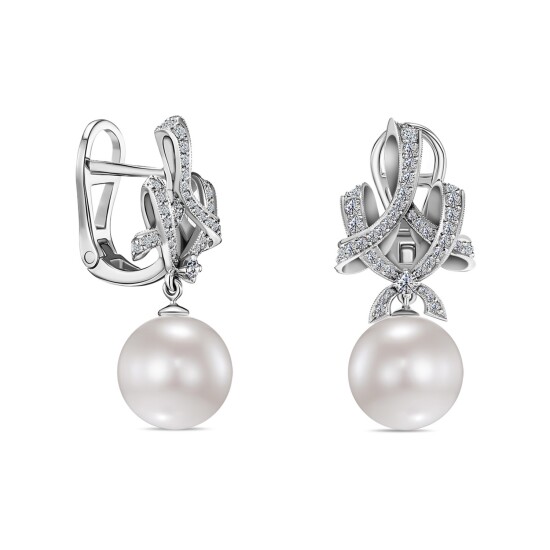 Роскошные серьги с натуральными бриллиантами огранок Круглый, общим весом 16.61 карат, выполнены из белого золота 585 пробы. Ювелирное украшение дополняют подлинный драгоценный камень Жемчуг культиви...