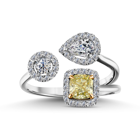 Элегантное кольцо с натуральными бриллиантами огранок Груша/Круглый/Кушон, общим весом 1.08 карат, выполнено из белого/желтого золота 750 пробы. Модель доступна в размере 17.5. Кольцо можно комбиниров...