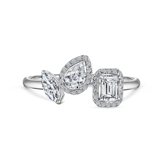 Элегантное кольцо с натуральными бриллиантами огранок Груша/Изумруд/Круглый/Маркиз, общим весом 0.76 карат, выполнено из белого золота 585 пробы. Модель доступна в размере 17.5. Кольцо можно комбиниро...