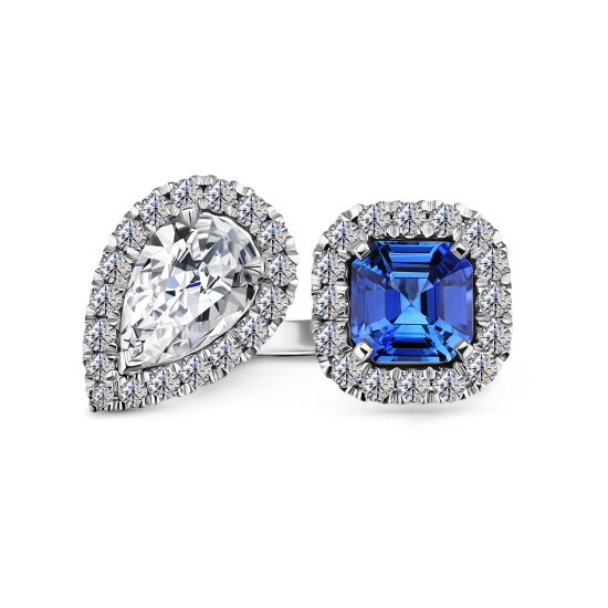 Элегантное кольцо с натуральными бриллиантами огранок Груша/Круглый, общим весом 2.74 карат, выполнено из белого золота 750 пробы. Ювелирное украшение дополняет подлинный драгоценный камень Сапфир те...