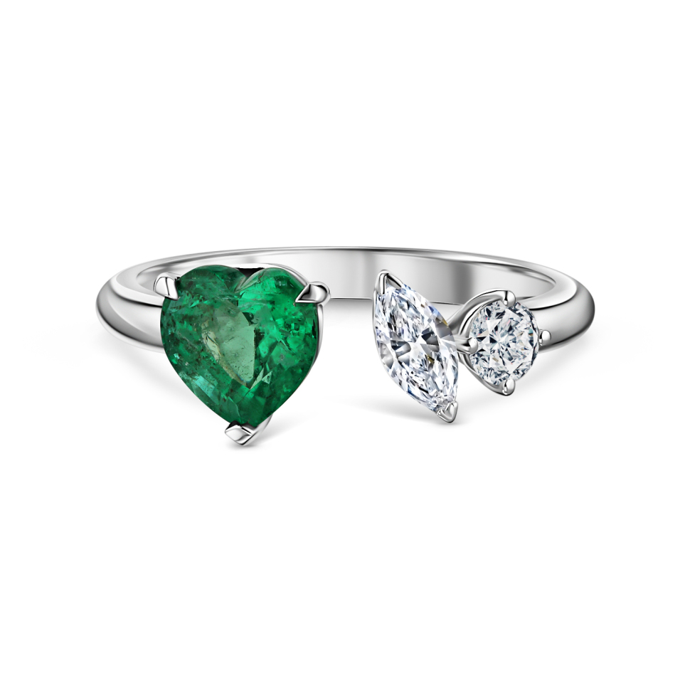 Элегантное кольцо с натуральными бриллиантами огранок Круглый/Маркиз, общим весом 1.13 карат, выполнено из белого золота 750 пробы. Ювелирное украшение дополняет подлинный драгоценный камень Изумруд,...